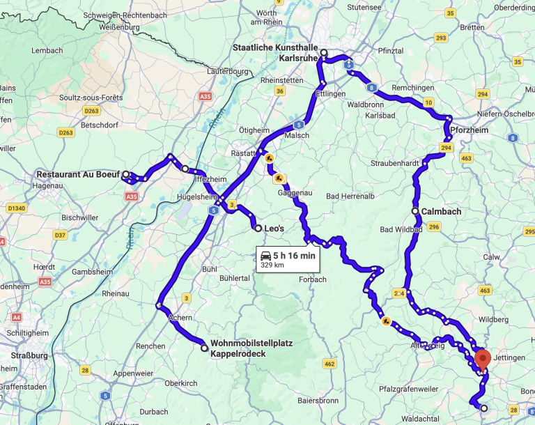 Von Nagold via Calmbach nach Karlsruhe. Dort gab es das Kunstmuseum zu besichtigen, danach in Baden-Baden auf einen Sprung in`s LEO´s-Cafe, einer meiner Lieblingsplätze. Und dann nach Kappelrodeck zur Übernachtung.